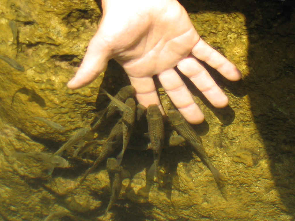 Sobald man sich nicht bewegt stürzen sich die Fische auf einen und fangen an die Horhaut zu knabbern.
